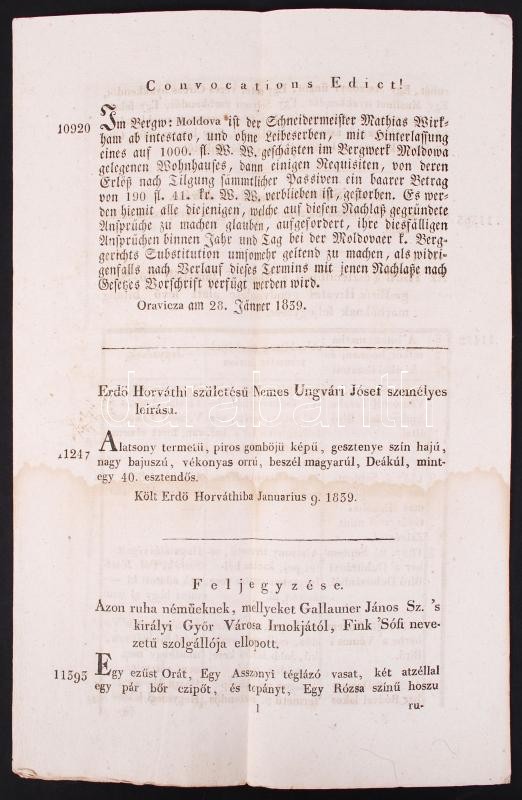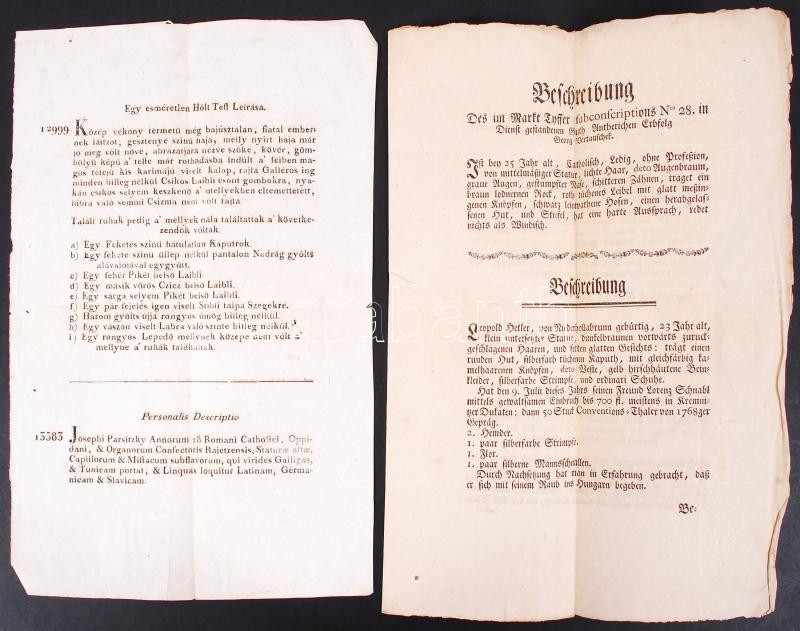 Beschreibung: 1776, 1839 Német és magyar nyelvű körözvények a körözött személyek részletes leírásaival (3 db).