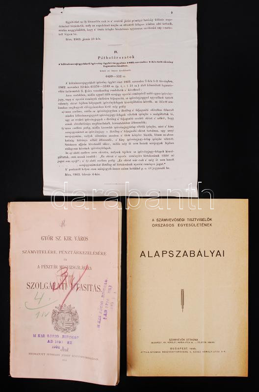 1863 Bécs, Póthatározatok kölcsönsorsjegyekkel kapcsolatban; 1898 Győr, Szolgálati utasítás Győr szabad királyi város számvitelére és pénztárkezelésére vonatkozóan; 1940 Budapest, A Számvevőségi Tisztviselők Országos Egyesületének alapszabályai.