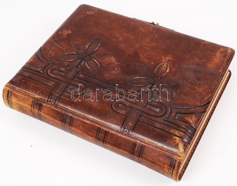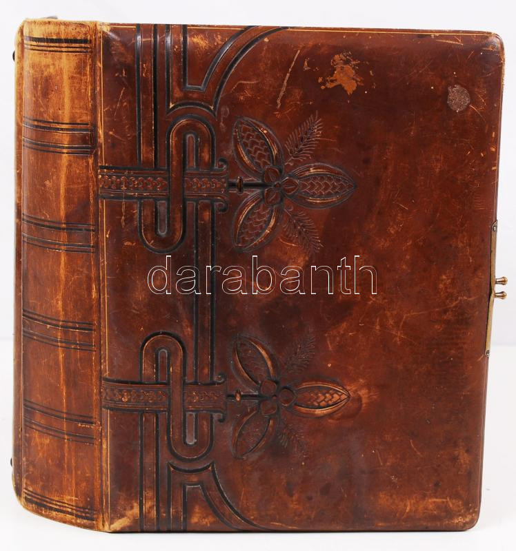 Beschreibung: cca 1890 Családi fotóalbum 83 db családi és portréfotóval bőr kötésben, aranyozott lapszélekkel, 120 fotóhellyel, kopottas, zárócsat hiányzik.