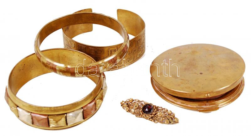 Beschreibung: 3 db réz karkötő, 1 db réz púdertató és egy csiszolt üveges réz kitüző
