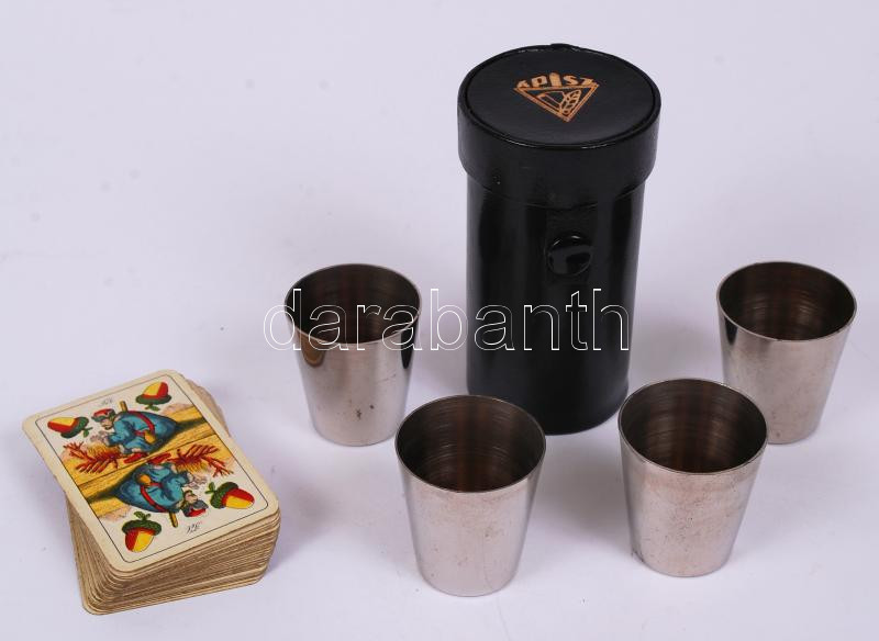 Beschreibung: 4 db rozsdamentes acél kupicás pohár, műbőr tokban + kicsi magyar kártya pakli