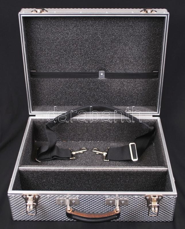 Beschreibung: Nagyméretű, alig használt fém bőrönd vállpánttal / Metal bagage 50x40x18 cm