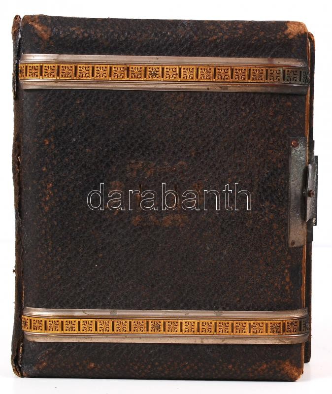 Beschreibung: cca 1890 Régi, használt fényképalbum 42 db vizitkártya méretű kép részére, réz csattal, a közepén embléma nélkül