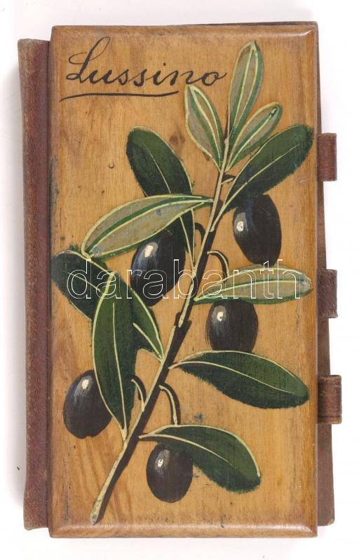 Beschreibung: cca 1900 Lussino feliratú fa borítású jegyzetfüzet aranyozott lapszélekkel / Note book with wooden covers 6x10 cm