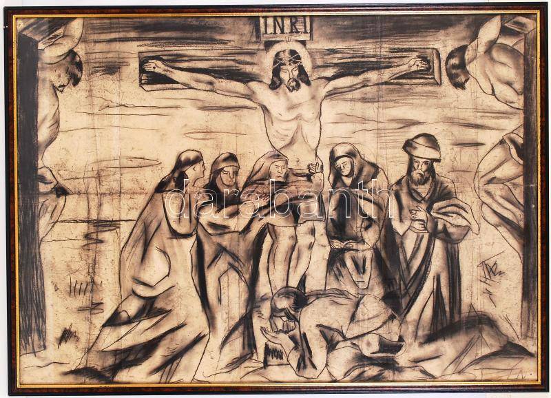 Beschreibung: Jelzés nélkül: Jézus a kereszten. Tus, papír, gyűrött, üvegezett keretben, 60×83 cm