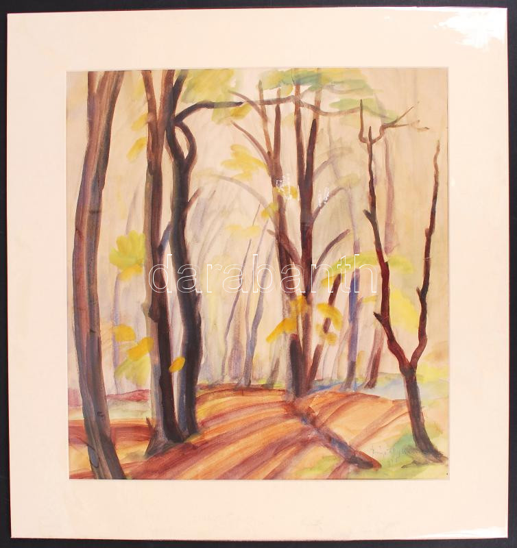 Beschreibung: Szigethy István (1891-1966): Erdő. Akvarell, papír, jelzett, paszpartuban, 43×40 cm