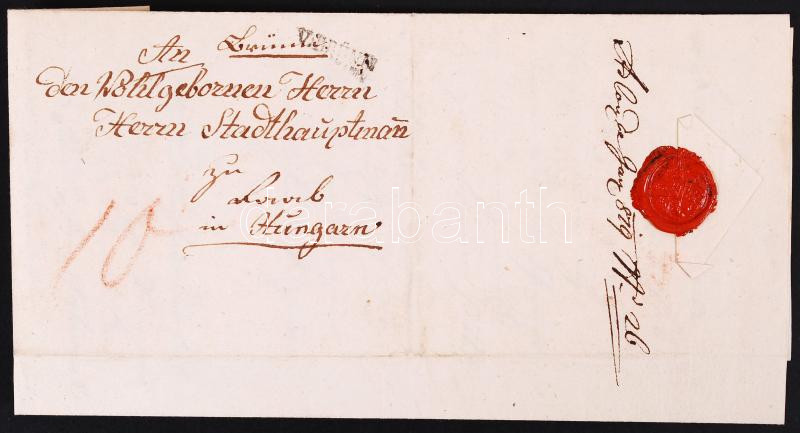 Beschreibung: 1819 Brünn, A városi főkapitánynak címzett levél Győrbe viaszpecséttel/