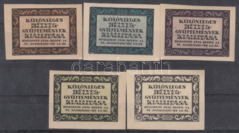 Beschreibung: 1921 Különleges Bélyeggyűjtemények kiállítása 5 db vágott levélzáró