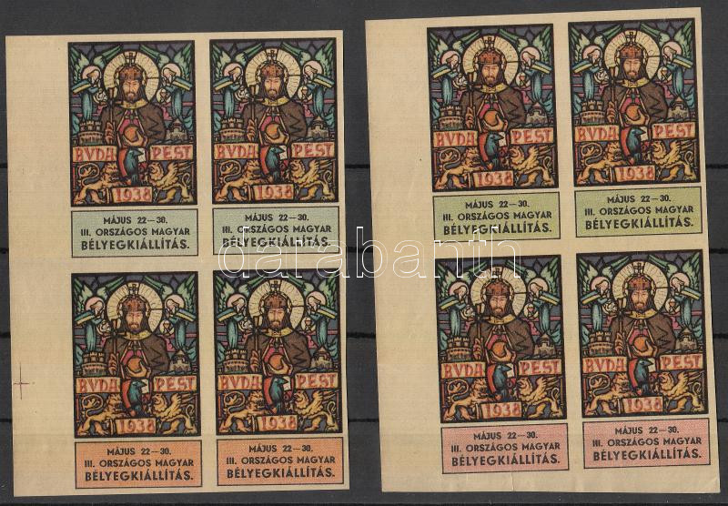1938 Bélyegkiállítás 2 db ívszéli vágott négyestömb levélzáró https://www.darabanth.com/de/197-Fernauktion/197.0/Andere-Sammelgebiete/Paraphilatelie~600014/1938-Belyegkiallitas-2-db-ivszeli-vagott-negyestomb-levelzaro~II639317