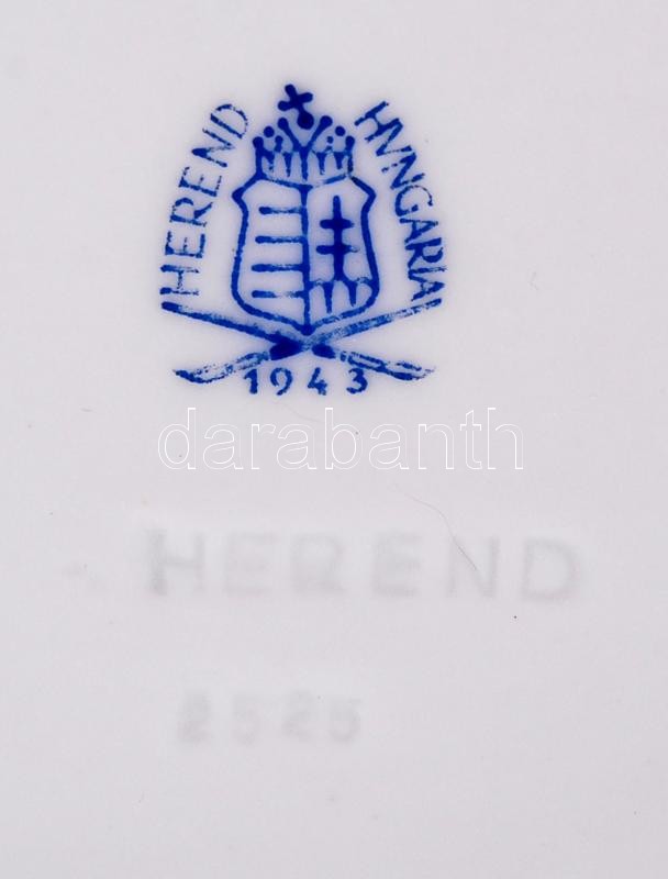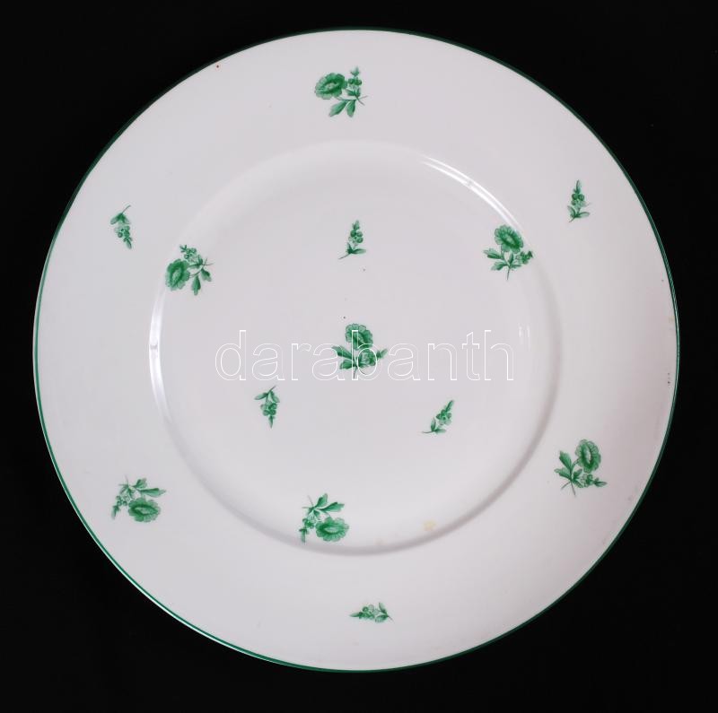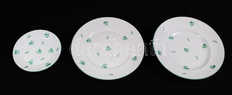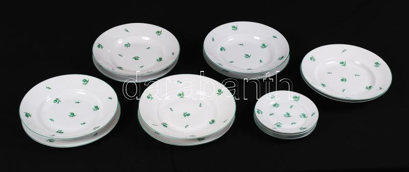 Herendi hiányos zöld virág mintás tányér készlet, jelzett (koronás), hibátlan, kézzel festett, 6 db mély d: 25,5 cm, 4 db lapos d:25,5 cm, 4 db süteményes d:16,5 cm, / Herend (crown marks) plate set