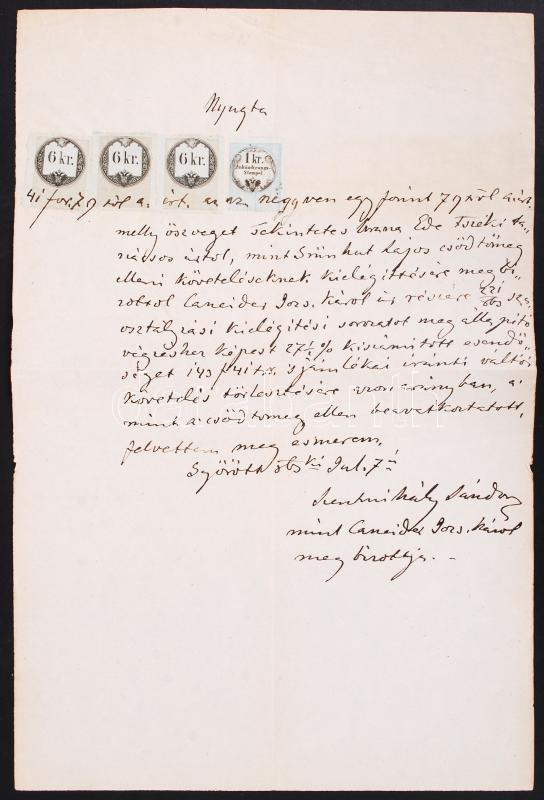 Beschreibung: 1863 Magyar nyelvű nyugta hirdetmény- és illetékbélyegekkel, 3db 6 koronás, 1 db 1 koronás.