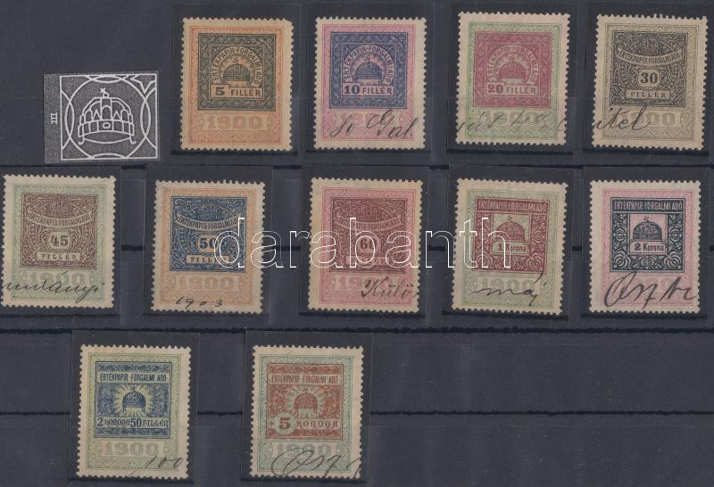 Beschreibung: 1900 Értékpapír- forgalmi adó illeték sor 11 db, benne 6 db vízjelfeláras
