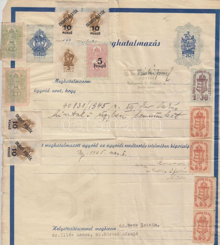 1945 Ügyvédi meghatalmazás sok illetékbélyeggel https://www.darabanth.com/de/197-Fernauktion/197.0/Andere-Sammelgebiete/Stempelmarken~600015/1945-Ugyvedi-meghatalmazas-sok-illetekbelyeggel~II750556