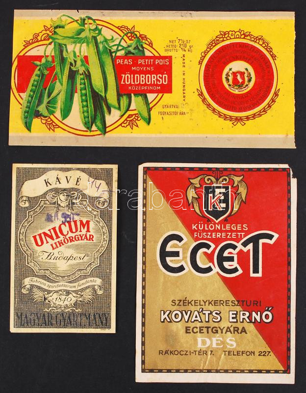Beschreibung: 3db régi címke: Unicum Likőrgyár kávé, Első Kecskeméti Konzervgyár R.T. zöldborsó, Székelykereszturi Kováts Ernő Ecetgyára