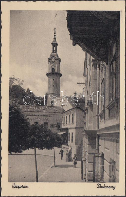Veszprém, Tűztorony, biztosítótársaság, gyógyszertár https://www.darabanth.com/de/197-Fernauktion/197.0/Ansichtskarten/Ungarn~800005/Veszprem-Tuztorony-biztositotarsasag-gyogyszertar~II760967