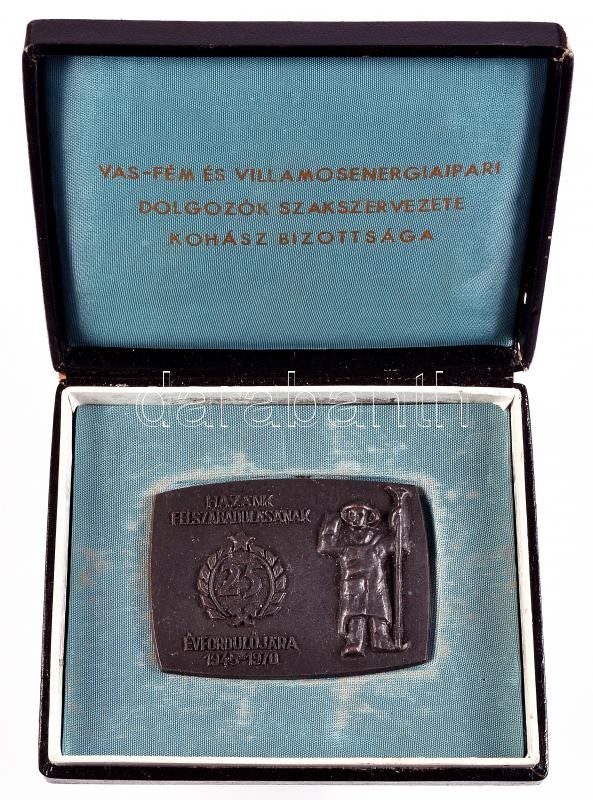 Beschreibung: 1970. Vas-fém és Villamosenergiaipari Dolgozók Szakszervezete Kohász Bizottsága "Hazánk Felszabadulásának 25. évfordulójára" plakett eredeti dísztokban T:2