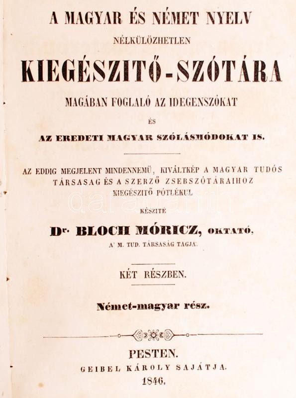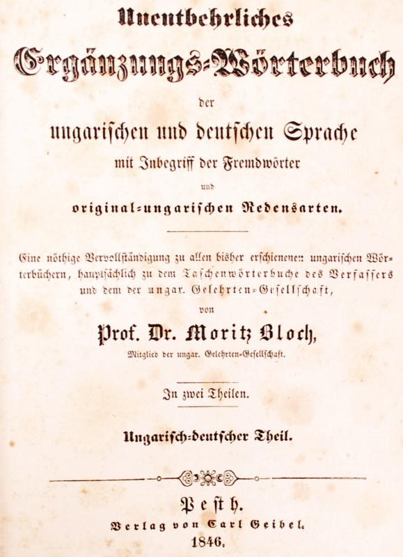 Bloch Móricz: A magyar és német nyelv kiegészítő szótára magában foglaló az idegenszókat és az eredeti magyar szólásmódokat is. I.-II. egybekötve. Pest 1846 Geibel Károly. Későbbi egészvészon kötésben