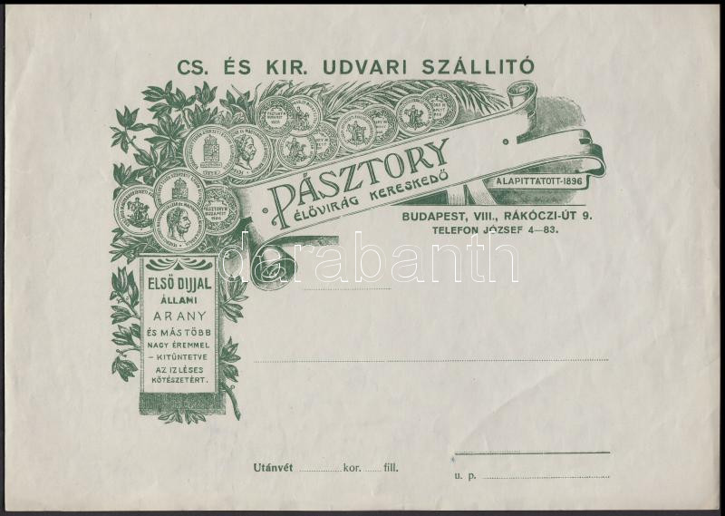 cca 1900 Bp., VIII. Pásztory élővirág kereskedő, császári és királyi u... https://www.darabanth.com/de/198-Fernauktion/198.0/Andere-Sammelgebiete/Dokument~200029/cca-1900-Bp-VIII-Pasztory-elovirag-kereskedo-csaszari-es-kiralyi-udvari-szallito-fej~II765408