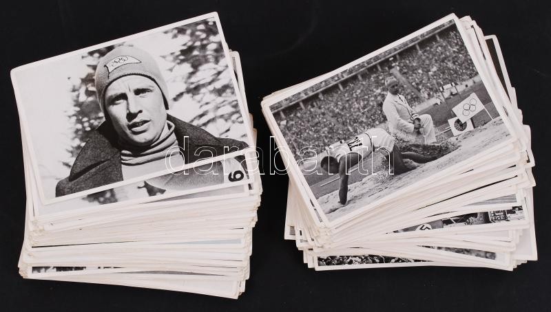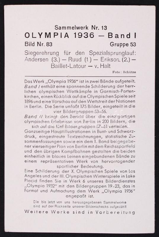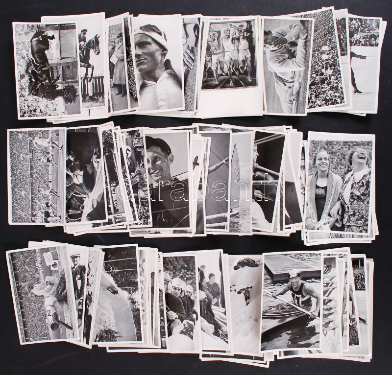 1936 Berlin, Fotógyűjtemény az olimpiáról (Sammelwerk Nr. 13, Nr. 14), hátoldalukon német nyelvű leírásokkal (Az "Olympia 1936" című mű I-II. részéből), 186 db kép, 12x8 cm.