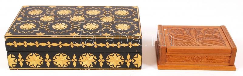 Beschreibung: 2 db díszített fa doboz, jó állapotban, 11×8 cm, 20×12 cm