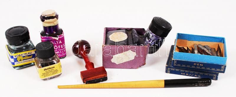 Beschreibung: Vegyes írószerek, üvegcsék, tollvégek, pecsétnyomó, 7 db.