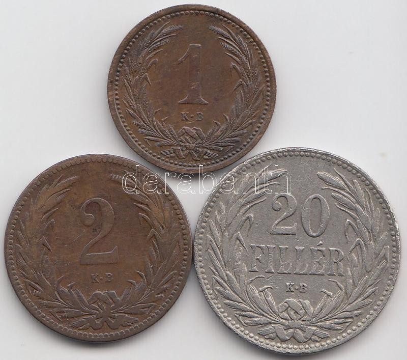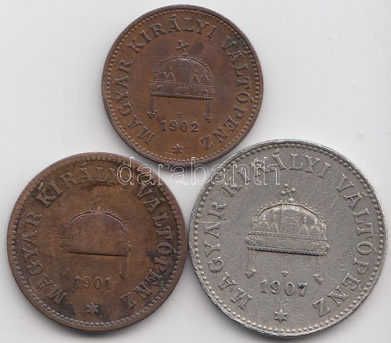 Adamo K1,2,4 https://www.darabanth.com/de/198-Fernauktion/198.0/Numismatik/Ungarische-Munzen~8/1902-1f-plus-1901-2f-plus-1907-20f-T2-2--3Cbr3EAdamo-K1-2-4~II769649