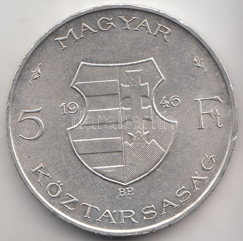 Adamo F8 https://www.darabanth.com/de/198-Fernauktion/198.0/Numismatik/Ungarische-Munzen~8/1946-5Ft-Ag-vastag-Kossuth-T2--3Cbr3EAdamo-F8~II767710