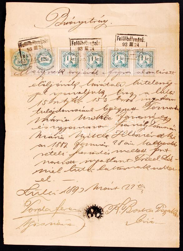 1893 6 db 1kr illetékbélyeg okmányon https://www.darabanth.com/de/199-Fernauktion/199.0/Andere-Sammelgebiete/Dokument~34/1893-6-db-1kr-illetekbelyeg-okmanyon~II780893