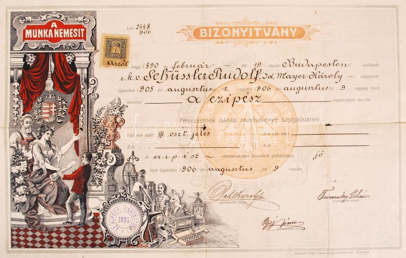 1906 Lithografált cipész oklevél 45x35 cm https://www.darabanth.com/de/199-Fernauktion/199.0/Andere-Sammelgebiete/Dokument~34/1906-Lithografalt-cipesz-oklevel-45x35-cm~II781450