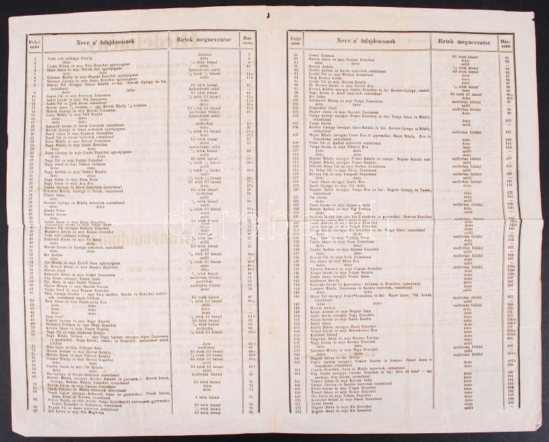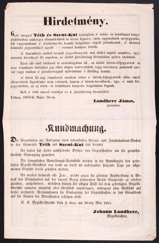 1853 Tét, Birtokfeljegyzési hirdetmény Tét és Szentkút községek vonatkozásában a tulajdonosok nevének és a birtok méretének részletes felsorolásával, 4 oldal.