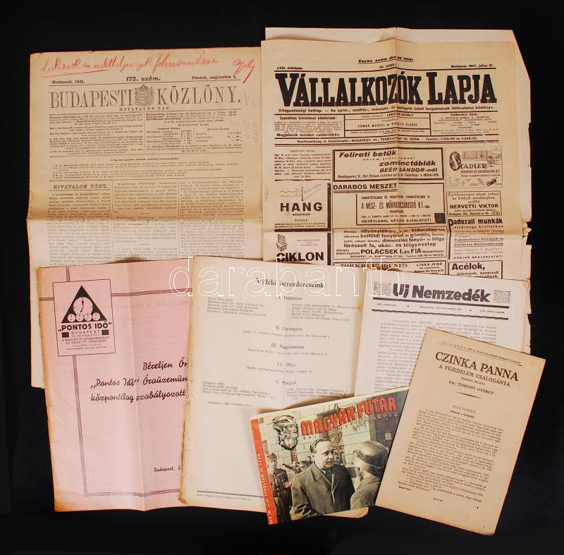 Beschreibung: 1925-1944 Vegyes újságok és újságrészletek,a Magyar Futár címlapja rajta Szálasi Ferenc, Vállalkozók Lapja, Budapesti Közlöny, Pontos Idő, Új Nemzedék.