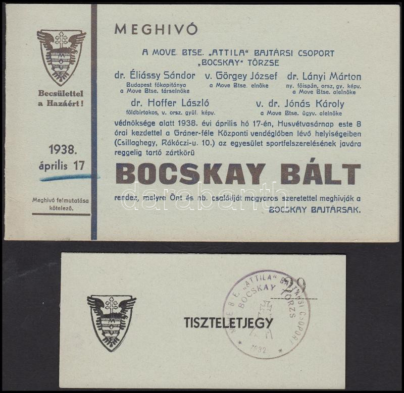 Beschreibung: 1938 MOVE Bocskay bál meghívó és tiszteletjegy