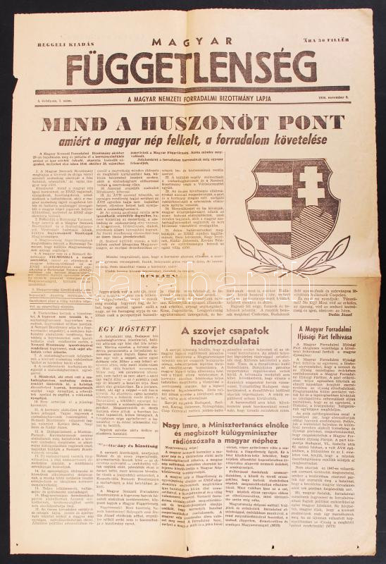 1956 Bp., Magyar Függetlenség, a Magyar Nemzeti Forradalmi Bizottmány ... https://www.darabanth.com/de/199-Fernauktion/199.0/Andere-Sammelgebiete/Drucksachen~6/1956-Bp-Magyar-Fuggetlenseg-a-Magyar-Nemzeti-Forradalmi-Bizottmany-lapja-a-forradalom-hireive~II779139