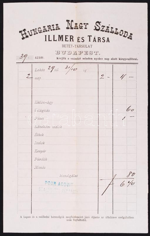 cca 1870 Bp., V. Hungaria Nagy Szálloda Illmer és Társa által kiállíto... https://www.darabanth.com/de/199-Fernauktion/199.0/Andere-Sammelgebiete/Drucksachen~6/cca-1870-Bp-V-Hungaria-Nagy-Szalloda-Illmer-es-Tarsa-altal-kiallitott-szallodai-szamla~II764487