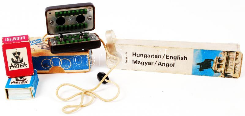 Beschreibung: Vegyes tétel-Német pengeélező, eredeti tokjában, 8×5 cm; cca 1990 Legyező alakú magyar-angol, angol-magyar szótár; Artex mini francia kártya 2 db.