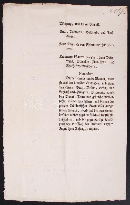 1774 Lista a megmelt behozatali vám alá eső árukról, vízjeles, merített papíron, német nyelven.