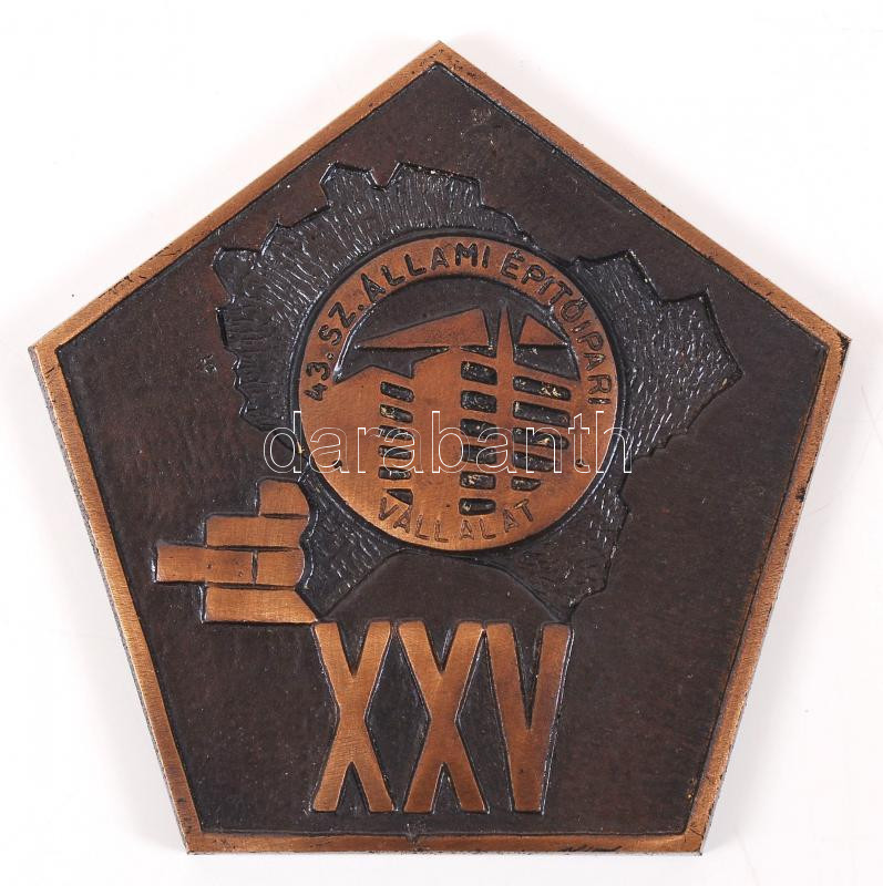 Beschreibung: "43. sz. Állami Építőipari Vállalat 25 éve az állami építőiparban a 100 éves Budapestért", ötszög alakú bronz plakett.