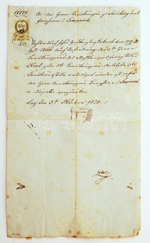 1820 Linz, német nyelvű ex officio levél Karl Freiherr von Lempurch (1789-?) kerületi biztos, későbbi császári tanácsos részére /