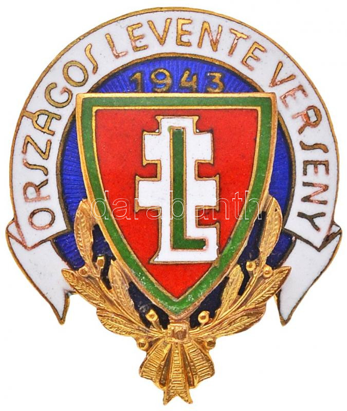1943. "Országos levente verseny" zománcozott, aranyozott rézötvözet je... https://www.darabanth.com/de/20-Gross-Auktion/20.1/Numismatik/Militaria~6895/1943-Orszagos-levente-verseny-zomancozott-aranyozott-rezotvozet-jelveny-26x22mm-T1--3Cbr~II980197