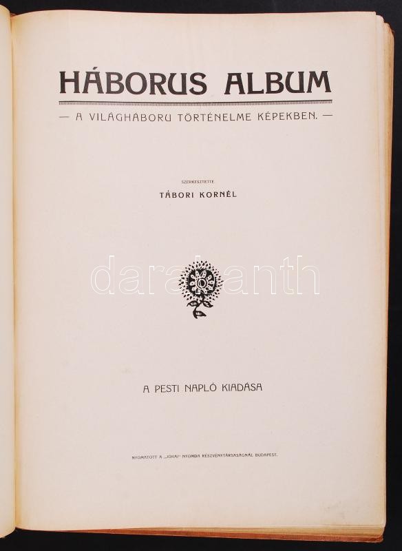 Tábori Kornél(szerk.): Háborús album. A világháború története képekben. A Pesti Napló kiadása. Bp., Jókai Nyomda. Kissé kopott, kiadói festett, egészvászon kötés, gerince sérült, képekkel gazdagon illusztrált.