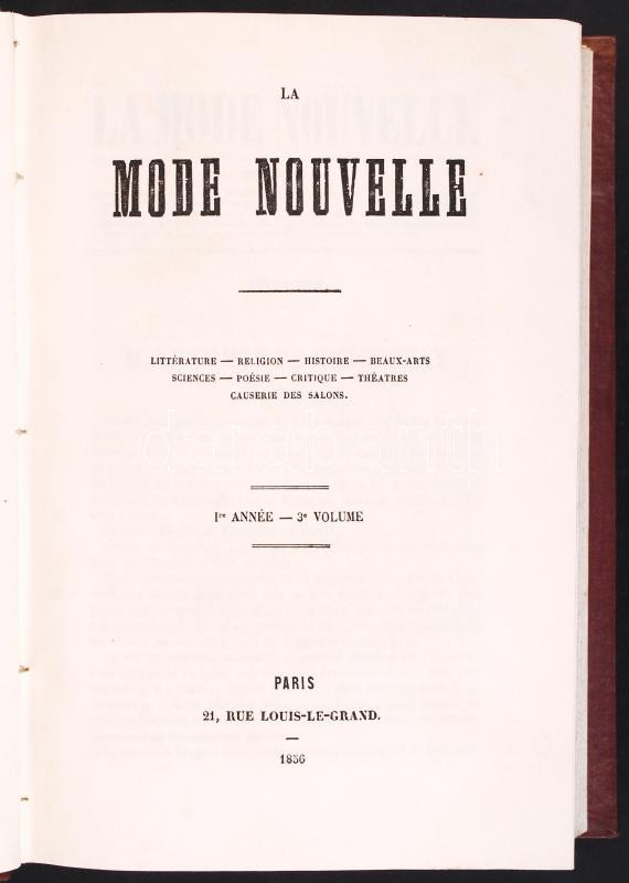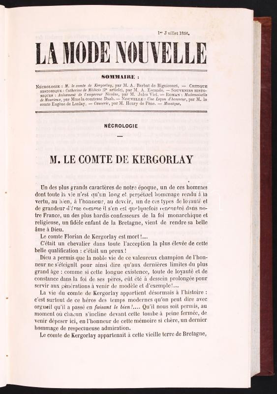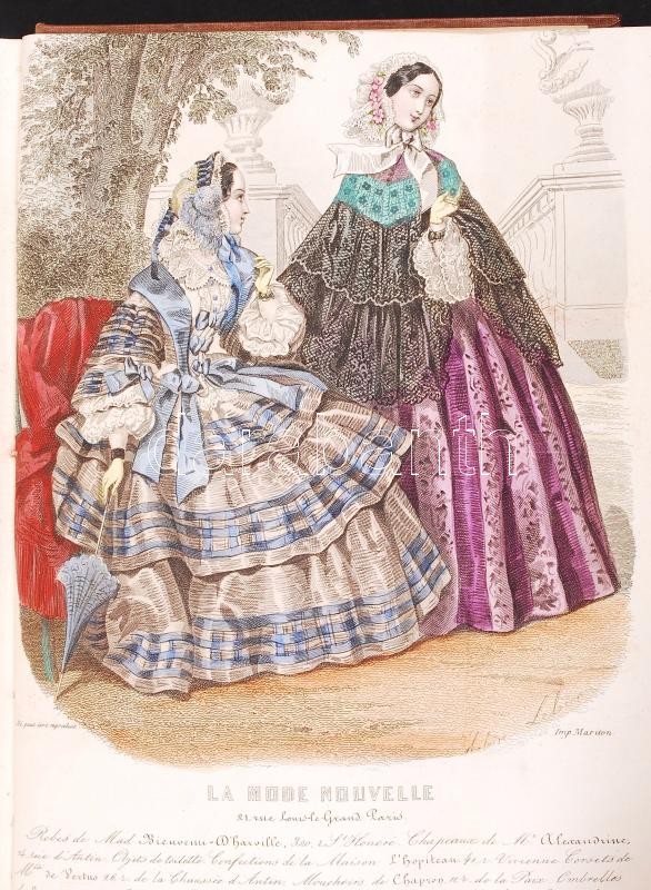 1856/57 La mode nouvelle. Littérature, religion, histoire, beaux-arts, sciences, poésie, critique, théâtres, causeries des salons. 1re Anne, 3-4. Livraison komplett évfolyam egészvászon kötésben, a végén 6 kiahajtható színezett metszettel / complete year in full linen binding with 6 colored etchings 448p.