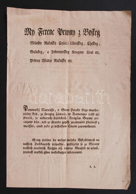 1807 I. Ferenc (1792-1806) pénzügyi rendelkezése a Márjásokkal és Hete... https://www.darabanth.com/de/200-Fernauktion/200.0/Andere-Sammelgebiete/Drucksachen~200009/1807-I-Ferenc-1792-1806-penzugyi-rendelkezese-a-Marjasokkal-es-Hetesekkel-kapcsolatban-ukrC3~II766175
