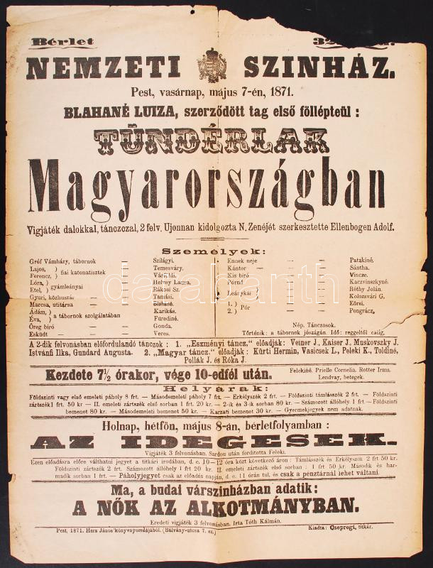 1871 Pest, Nemzeti Színház plakátja, Blaha Lujza első fellépése a Tünd... https://www.darabanth.com/de/200-Fernauktion/200.0/Andere-Sammelgebiete/Drucksachen~200009/1871-Pest-Nemzeti-Szinhaz-plakatja-Blaha-Lujza-elso-fellepese-a-Tunderlak-Magyarorszagban~II783791