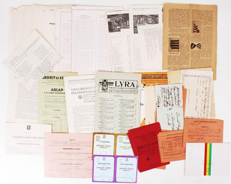 Beschreibung: cca 1915-1948 MeghÃvók,megrendelÅ‘ jegyek, körlevelek, szórólapok (Budapest székesfÅ‘város polgármestere által kiállÃtott meghÃvó, kézbesÃtÅ‘ Ãv, újságcikk Magyar történelmi lobogók cÃmmel); felhasználatlan Rákosi-cÃmerrel ellátott közjegyzÅ‘i okiratpapÃrok.