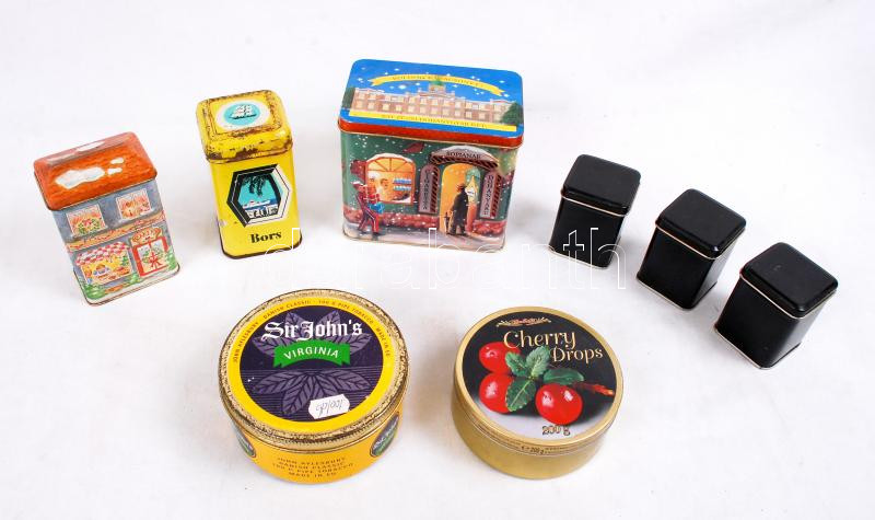 Beschreibung: cca 1950-1980 Fém dobozok, 8 db, (Pécsi Dohánygyár Rt., Sir John's Virginia Pipe Tobacco, Cherry Drops).