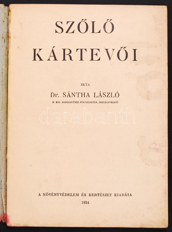 Dr. Sántha László: Szőlő kártevői. Bp., 1934 Növényvédelem és kertésze... https://www.darabanth.com/de/201-Fernauktion/201.0/Andere-Sammelgebiete/Bucher-Kuche-und-Garten~200013/Dr-Santha-Laszlo-Szolo-kartevoi-Bp-1934-Novenyvedelem-es-kerteszet~II796463
