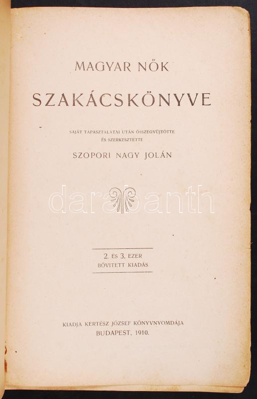 Szopori Nagy Jolán: Magyar nők szakácskönyve Bp., 1910 Kertész József.... https://www.darabanth.com/de/201-Fernauktion/201.0/Andere-Sammelgebiete/Bucher-Kuche-und-Garten~200013/Szopori-Nagy-Jolan-Magyar-nok-szakacskonyve-Bp-1910-Kertesz-Jozsef-Szetvalt-allapotban~II796234