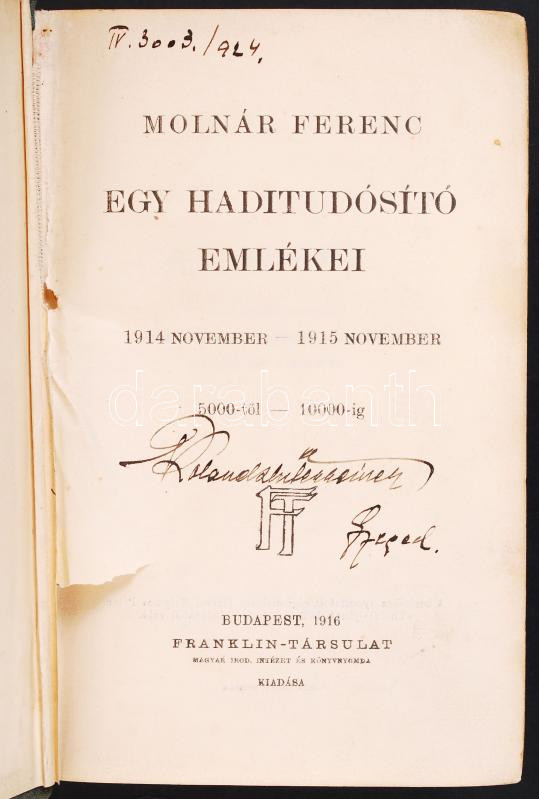 Molnár Ferenc: Egy haditudósító emlékei 1914-1915; Bp., 1916 Franklin.... https://www.darabanth.com/de/201-Fernauktion/201.0/Andere-Sammelgebiete/Bucher-Militaria~200017/Molnar-Ferenc-Egy-haditudosito-emlekei-1914-1915-Bp-1916-Franklin-Kisse-megviselt-festett~II794672