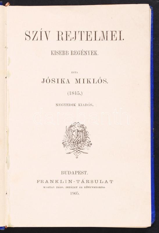Jósika Miklós: Szív rejtelmei. Kisebb regények. Negyedik kiadás. Bp., ... https://www.darabanth.com/de/201-Fernauktion/201.0/Andere-Sammelgebiete/Bucher-Sonstige-Raritaten~200037/Josika-Miklos-Sziv-rejtelmei-Kisebb-regenyek-Negyedik-kiadas-Bp-1905-Franklin-Egeszva~II794462