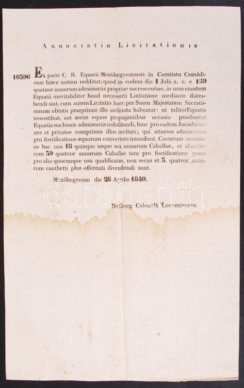 Beschreibung: 1840 Mezőhegyes, Mezőhegyesi árverés (Annunciatio Licitationis) latin nyelven